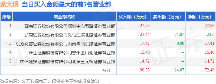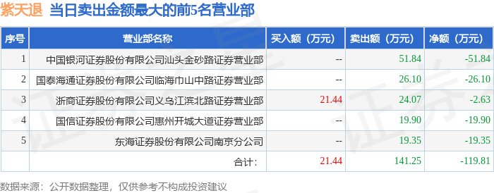 证券之星消息,沪深交易所2025年9月26日公布的交易公开信息显示,紫天退(300280)因退市整理期登上龙虎榜。此次是近5个交易日内第5次上榜。