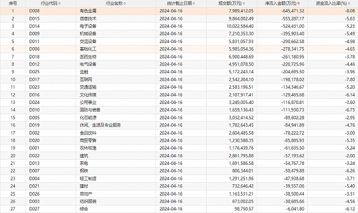 4月16日消息,Choice数据统计,今日A股主力资金净流出476.93亿元;行业方面,净流出金额最多的是有色金属,为64.55亿元,信息技术净流出55.53亿元,电子设备净流出52.44亿元。个股方面,主力资金净流入前三的是苏交科、农业银行、赛力斯,分别净流入1.34亿元、1.32亿元、1.25亿元;净流出前三的是长安汽车、中信海直、赤峰黄金,分别净流出6.61亿元、4.64亿元、3.65亿元。