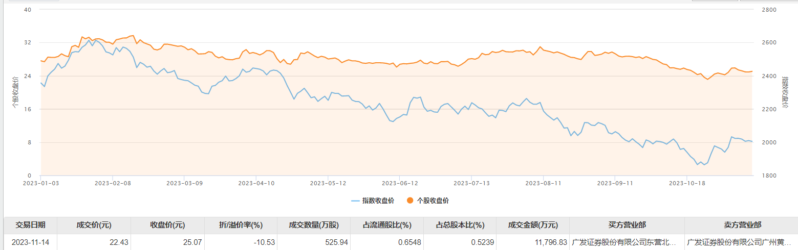 11月14日大宗交易成交525.94万股,成交额1.18亿元,占当日总成交额的57.74%,成交价22.43元,较市场收盘价折价10.53%。