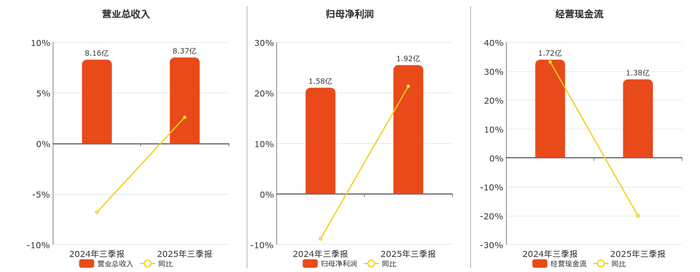公司营业总收入为8.37亿元。归母净利润为1.92亿元。经营活动现金净流入为1.38亿元,较去年同报告期经营活动现金净流入减少3458.49万元,同比较去年同期下降20.06%。