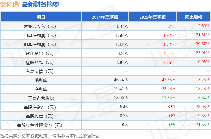 据证券之星公开数据整理,近期安科瑞(300286)发布2025年三季报。截至本报告期末,公司营业总收入8.37亿元,同比上升2.6%,归母净利润1.92亿元,同比上升21.31%。按单季度数据看,第三季度营业总收入2.98亿元,同比上升4.56%,第三季度归母净利润6666.52万元,同比上升15.2%。本报告期安科瑞盈利能力上升,毛利率同比增幅3.23%,净利率同比增幅18.28%。
