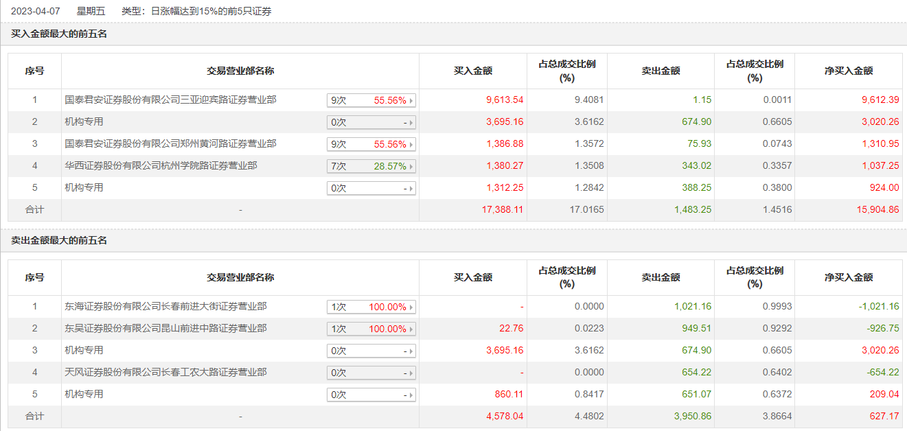 朗玛信息今日涨停,龙虎榜数据显示,上榜营业部席位全天成交2.3亿元,占当日总成交金额比例为22.54%。其中,买入金额为1.83亿元,卖出金额为4759.22万元,合计净买入1.35亿元。