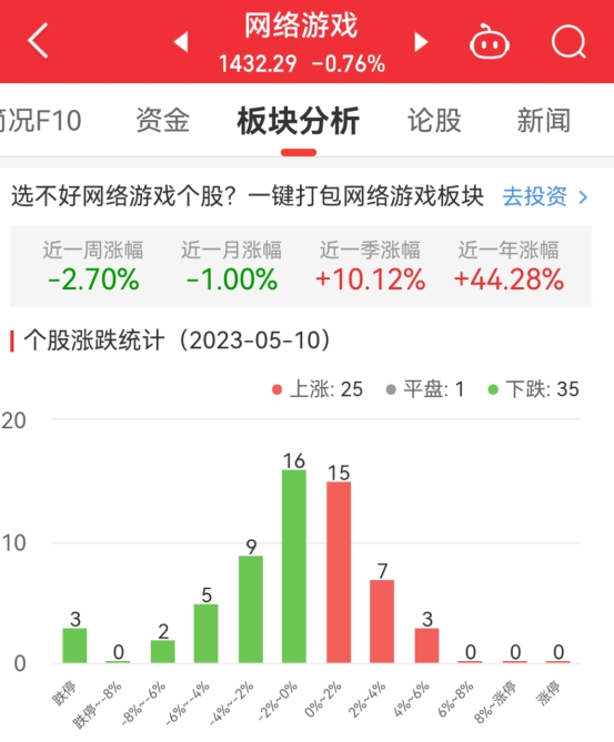 中国经济网北京5月10日讯今日,网络游戏板块整体跌幅0.76%,其中25只股票上涨,1只股票平盘,35只股票下跌。