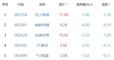 巨人网络、皖新传媒、完美世界、ST鼎龙、*ST美盛位列涨幅榜后五位,涨幅分别为-7.40%、-6.00%、-5.32%、-5.05%、-5.02%。