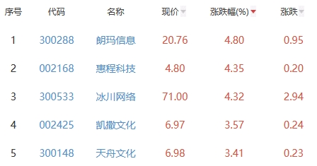 其中,朗玛信息、惠程科技、冰川网络、凯撒文化、天舟文化位列板块涨幅前五位,涨幅分别为4.80%、4.35%、4.32%、3.57%、3.41%。