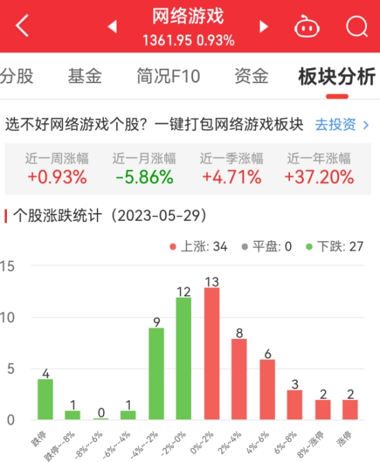 中国经济网北京5月29日讯今日,网络游戏板块整体涨幅0.93%,其中34只股票上涨,27只股票下跌。