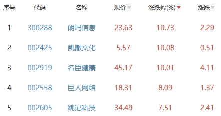 其中,朗玛信息、凯撒文化、名臣健康、巨人网络、姚记科技位列板块涨幅前五位,涨幅分别为10.73%、10.08%、10.01%、8.09%、7.51%。