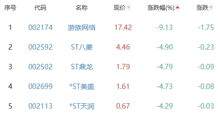 游族网络、ST八菱、ST鼎龙、*ST美盛、*ST天润位列涨幅榜后五位,涨幅分别为-9.13%、-4.90%、-4.79%、-4.73%、-4.29%。