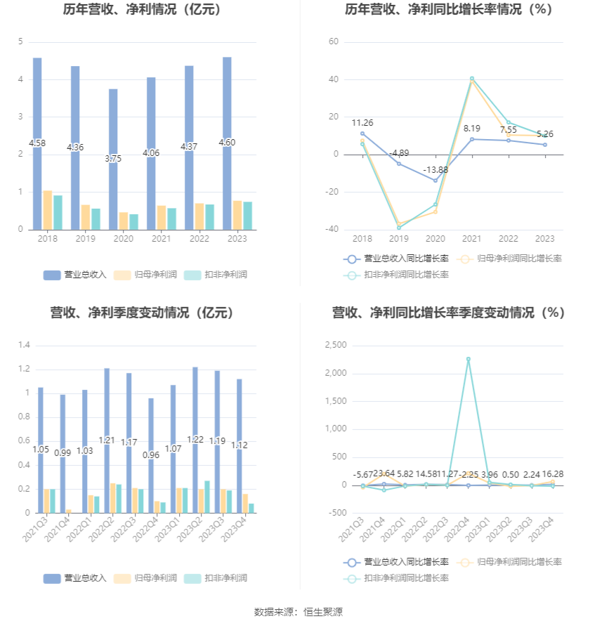 2023年,公司毛利率为39.01%,同比上升1.25个百分点;净利率为17.04%,较上年同期上升1.58个百分点。从单季度指标来看,2023年第四季度公司毛利率为36.30%,同比上升4.43个百分点,环比下降1.57个百分点;净利率为15.63%,较上年同期上升6.57个百分点,较上一季度下降2.62个百分点。