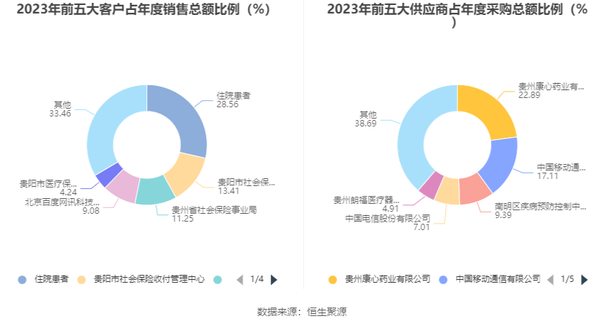 分产品来看,2023年公司主营业务中,医疗服务收入1.99亿元,同比增长21.54%,占营业收入的43.19%;移动转售业务收入1.39亿元,同比增长11.67%,占营业收入的30.18%;医疗信息服务收入1.01亿元,同比下降18.88%,占营业收入的21.90%。