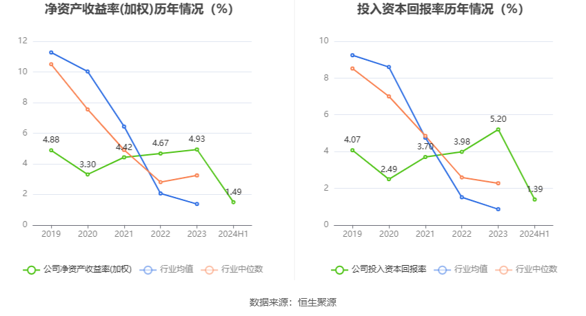 数据显示,2024年上半年公司加权平均净资产收益率为1.49%,较上年同期下降1.19个百分点;公司2024年上半年投入资本回报率为1.39%,较上年同期下降0.89个百分点。