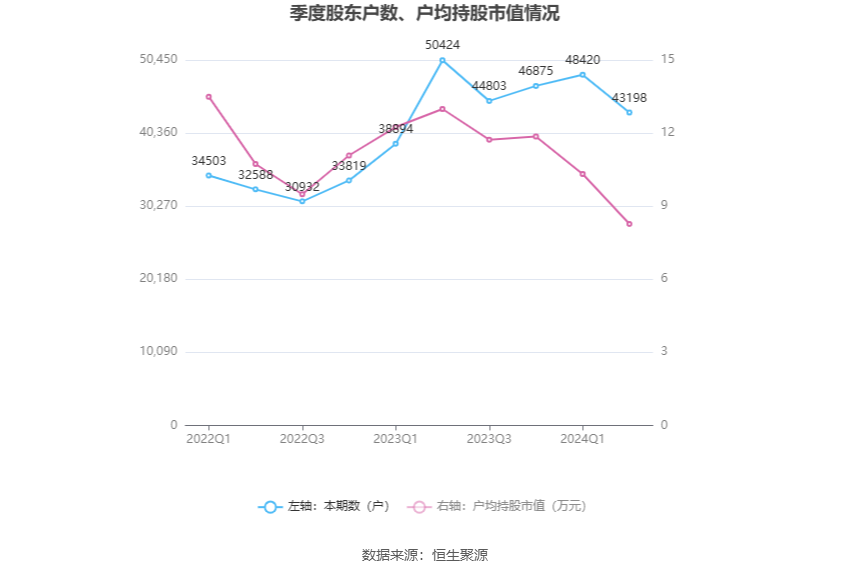 筹码集中度方面,截至2024年上半年末,公司股东总户数为4.32万户,较一季度末下降了5222户,降幅10.78%;户均持股市值由一季度末的10.32万元下降至8.27万元,降幅为19.86%。