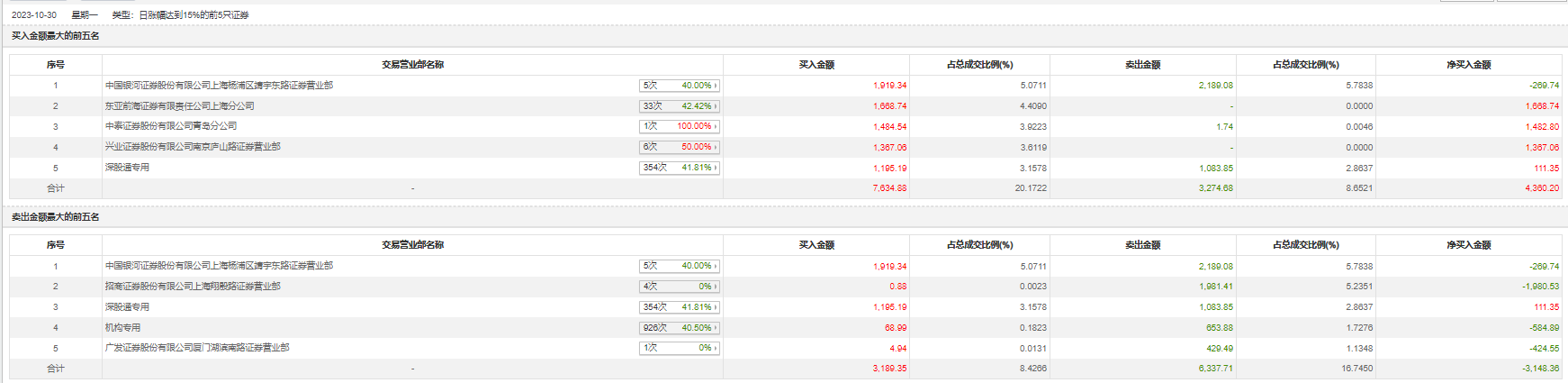 10月30日,百纳千成今日涨停,全天换手率达7.65%,振幅达20.96%。龙虎榜数据显示,营业部席位合计净买入1370.23万元。其中,机构买入68.99万元,卖出653.88万元,合计净卖出584.89万元。此外,中国银河证券上海杨浦区靖宇东路证券营业部、东亚前海证券上海分公司分别买入1919.34万元、1668.74万元;中国银河证券上海杨浦区靖宇东路证券营业部、招商证券上海翔殷路证券营业部分别卖出2189.08万元、1981.41万元。