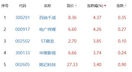 其中,百纳千成、电广传媒、ST鼎龙(维权)、华策影视、姚记科技位列板块涨幅前五位,涨幅分别为4.37%、4.26%、3.85%、3.74%、3.40%。