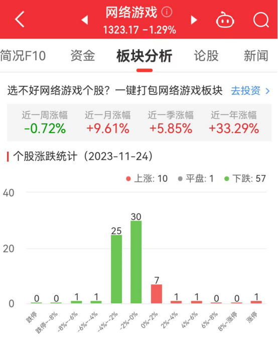 中国经济网北京11月24日讯今日,网络游戏板块整体跌幅1.29%,其中10只股票上涨,1只股票平盘,57只股票下跌。