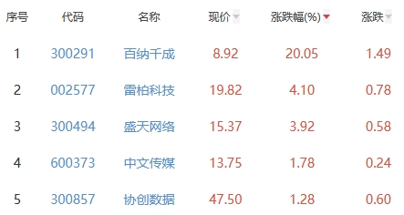 其中,百纳千成、雷柏科技、盛天网络、中文传媒、协创数据位列板块涨幅前五位,涨幅分别为20.05%、4.10%、3.92%、1.78%、1.28%。