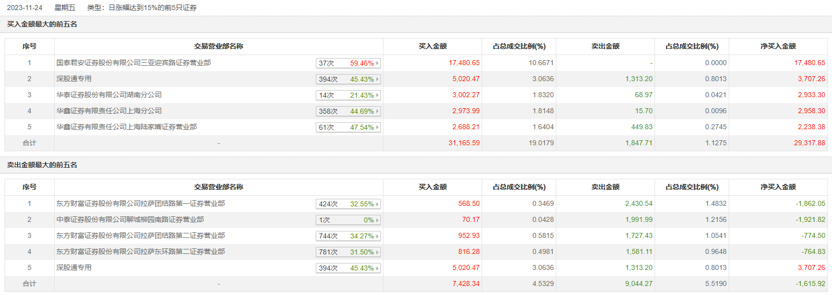 其中,国泰君安证券三亚迎宾路证券营业部、深股通专用分别买入1.75亿元、5020.47万元;东方财富证券拉萨团结路第一证券营业部、中泰证券聊城柳园南路证券营业部分别卖出2430.54万元、1991.99万元。