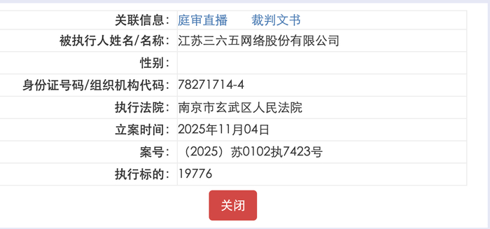 瑞财经 严明会 近日,江苏三六五网络股份有限公司被列入被执行人,案号为(2025)苏0102执7423号,执行标的为19776元,执行法院为江苏省南京市玄武区人民法院,立案日期为2025-11-04。