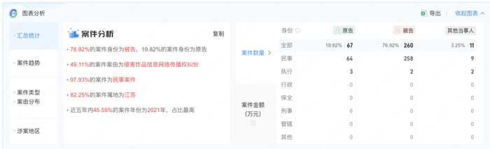 据天眼查,江苏三六五网络股份有限公司共涉及司法案件338件,其中,76.92%的案件身份为被告,19.82%的案件身份为原告,49.11%的案件案由为侵害作品信息网络传播权纠纷,97.93%的案件为民事案件。