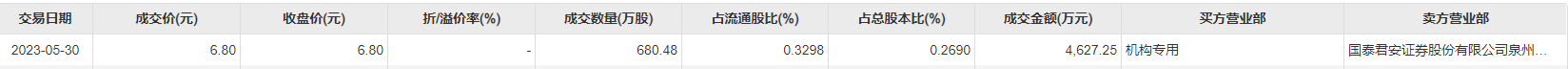 5月30日大宗交易成交680.48万股,成交额4627.25万元,占当日总成交额的18.54%,成交价6.8元,较市场收盘价6.8元持平。