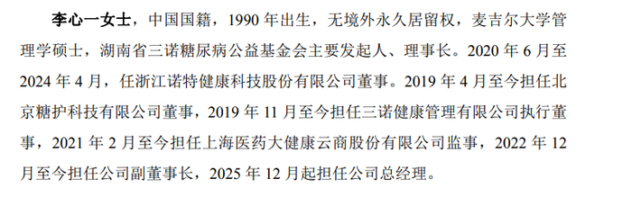 她拥有麦吉尔大学管理学硕士学位,自2019年起便涉足糖尿病管理及大健康领域,先后担任北京糖护科技有限公司董事、三诺健康管理有限公司执行董事等职,深度参与产业链上下游业务。在公司内部,她于2022年12月当选副董事长,早已深度介入企业战略规划与运营管理,完成了从“旁观者”到“参与者”的角色蜕变。