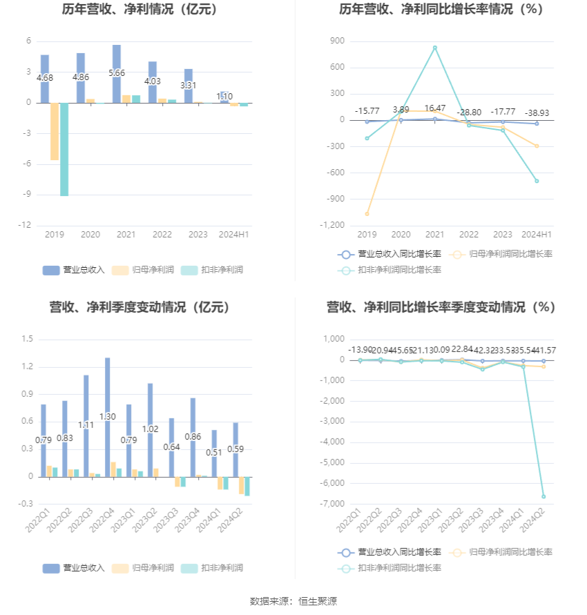 根据半年报,公司第二季度实现营业总收入5948.33万元,同比下降41.57%,环比增长16.70%;归母净利润-1889.47万元,同比下降318.81%,环比下降34.69%;扣非净利润-2063.93万元,同比下降6634.26%,环比下降45.23%。
