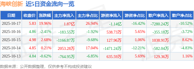 证券之星消息,海峡创新10月17日涨停收盘,收盘价5.83元。该股于9点54分涨停,2次打开涨停,截止收盘封单资金为2647.46万元,占其流通市值0.68%。