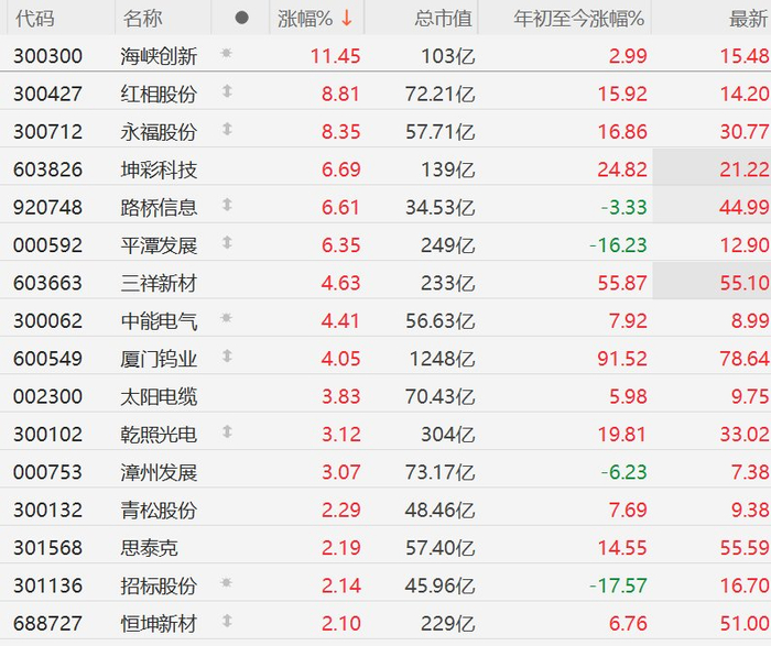 A股部分福建概念股逆势上涨,海峡创新涨超11%