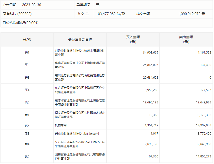 同有科技今日涨停,龙虎榜数据显示,上榜营业部席位全天成交1.89亿元,占当日总成交金额比例为17.35%。其中,买入金额为1.15亿元,卖出金额为7379.15万元,合计净买入4167.87万元。