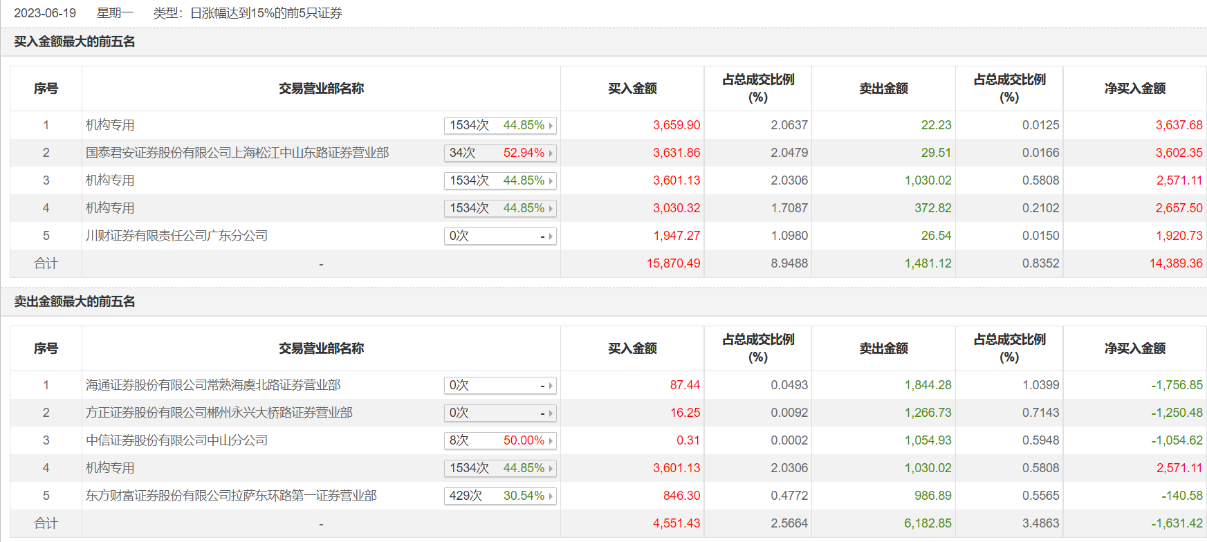 同有科技今日涨停,龙虎榜数据显示,上榜营业部席位全天成交2.35亿元,占当日总成交金额比例为13.23%。其中,买入金额为1.68亿元,卖出金额为6633.95万元,合计净买入1.02亿元。