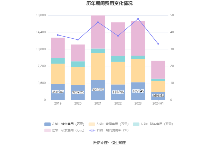 2024年上半年,公司期间费用为8369.89万元,较上年同期增加339.68万元;但期间费用率为33.20%,较上年同期下降6.47个百分点。其中,销售费用同比下降6.11%,管理费用同比增长2.26%,研发费用同比增长12.2%,财务费用同比下降3.5%。