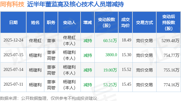 证券之星消息,根据12月25日市场公开信息、上市公司公告及交易所披露数据整理,同有科技(300302)最新董监高及相关人员股份变动情况:2025年12月24日公司董事佟易虹共减持公司股份60.51万股,占公司总股本为0.1263%。变动期间公司股价上涨1.76%,12月24日当日收盘报18.53元。
