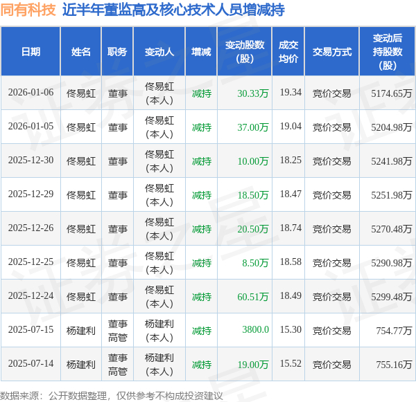 同有科技近半年内的董监高及核心技术人员增减持详情如下: