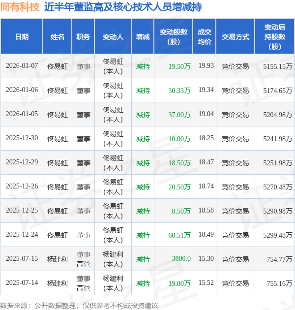同有科技近半年内的董监高及核心技术人员增减持详情如下: