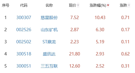 其中,慈星股份、山东矿机、ST鼎龙、盛讯达、三五互联位列板块涨幅前五位,涨幅分别为10.43%、6.30%、5.19%、2.93%、2.52%。