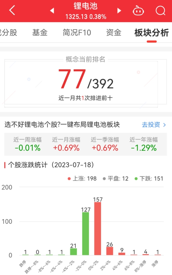 中国经济网北京7月18日讯今日,锂电池板块整体涨幅0.38%,其中198只股票上涨,12只股票平盘,151只股票下跌。