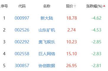 新大陆、山东矿机、奥飞娱乐、巨人网络、协创数据位列涨幅榜后五位,涨幅分别为-4.62%、-4.53%、-2.85%、-2.83%、-2.81%。