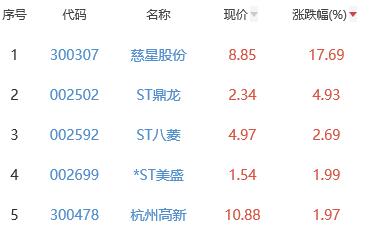 其中,慈星股份、ST鼎龙、ST八菱、*ST美盛、杭州高新位列板块涨幅前五位,涨幅分别为17.69%、4.93%、2.69%、1.99%、1.97%。