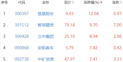 其中,慈星股份、智信精密、立中集团、安凯客车和中矿资源位列板块涨幅前五位,涨幅分别为12.04%、9.70%、8.94%、7.82%和7.41%。
