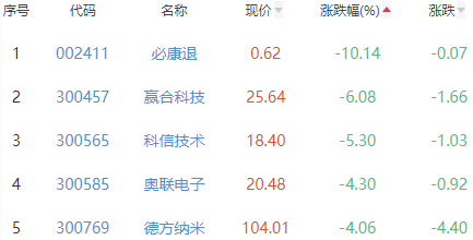 必康退、赢合科技、科信技术、奥联电子和德方纳米位列涨幅榜后五位,涨幅分别为-10.14%、-6.08%、-5.30%、-4.30%和-4.06%。