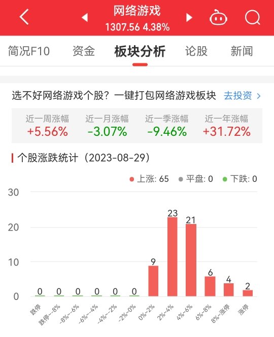 中国经济网北京8月29日讯今日,网络游戏板块整体涨幅4.38%,其中65只股票均上涨。
