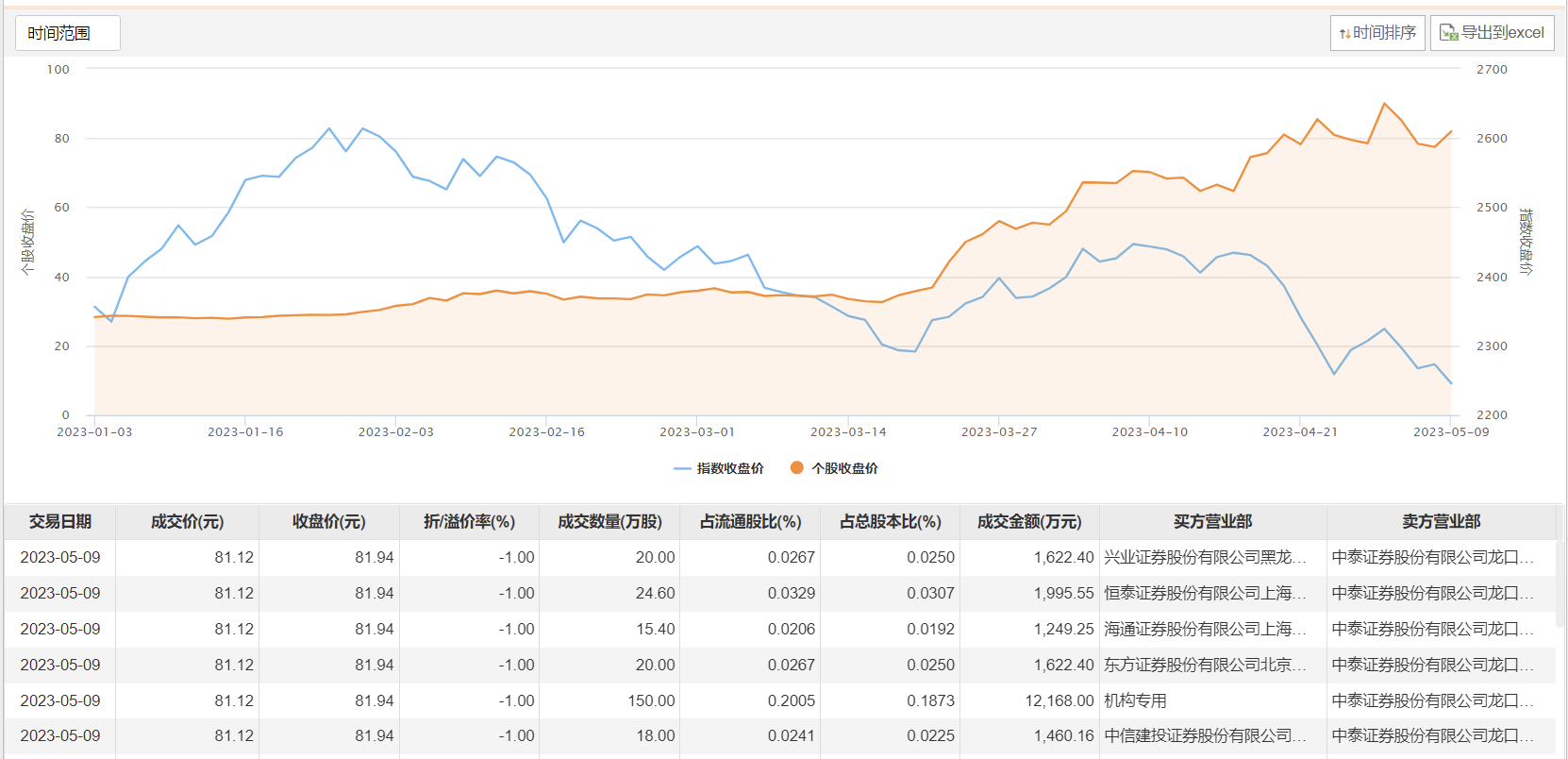 大宗交易成交248万股,成交额2.01亿元,占当日总成交额的4.91%,成交价81.12元,较市场收盘价81.94元折价1.0%。