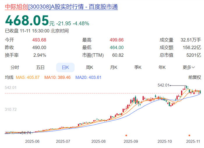 三季报后,中际旭创股价高台跳水,截至10月31日收盘跌8.11%。10月30日和31日两天,公司股价下跌超9%,市值缩水约530亿元。截至11月11日收盘,该股报468元/股,下跌5.5%,总市值5201亿元。