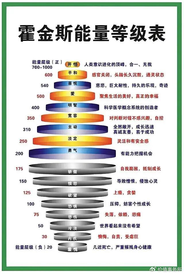 美国很著名的一位医学博士戴维·霍金斯通过几十年的研究发现,人类各种不同的意识层次都有其相对应的能量指数,人的身体状况也会随着精神状况有强弱的起伏,如果人的意念振动频率在200以上,就几乎不会生病。