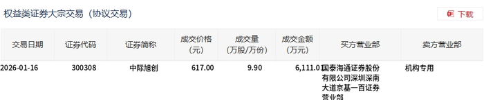 中际旭创今日大宗交易平价成交9.9万股,成交额6111.01万元