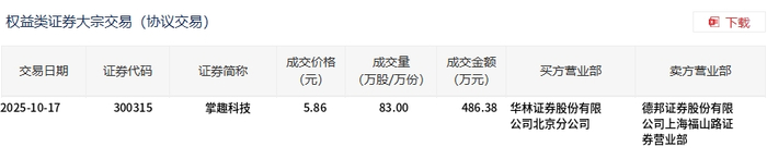10月17日,掌趣科技大宗交易成交83万股,成交额486.38万元,占当日总成交额的1.75%,成交价5.86元,较市场收盘价5元溢价17.2%。