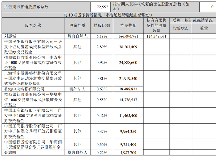 截至2025年9月30日,刘惠城持股为6.13%,中国民生银行股份有限公司-华夏中证动漫游戏交易型开放式指数证券投资基金持股2.89%,招商银行股份有限公司-华夏中证1000交易型开放式指数证券投资基金持股0.92%,上海浦东发展银行股份有限公司-国泰中证动漫游戏交易型开放式指数证券投资基金持股0.81%等。