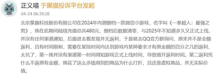 一名网友表示,掌趣科技在2024年内测删档一款微信小游戏,名字叫《一拳超人:最强之男》,他在此期间陆续充值总共480元,删档后数据清零,但2025年不知道多久又正式上线,并没有任何渠道通知,后面进去看发现并无返利。