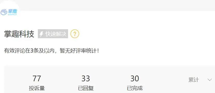 在“黑猫投诉[下载黑猫投诉客户端]”平台上,有关掌趣科技的投诉量,有77条,其中提及的问题包括“游戏海外登录异常”“APP引导充值”“多次删档测试割韭菜”等。
