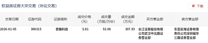 1月5日,掌趣科技大宗交易成交53万股,成交额307.93万元,占当日总成交额的0.53%,成交价5.81元,较市场收盘价5.16元溢价12.6%。